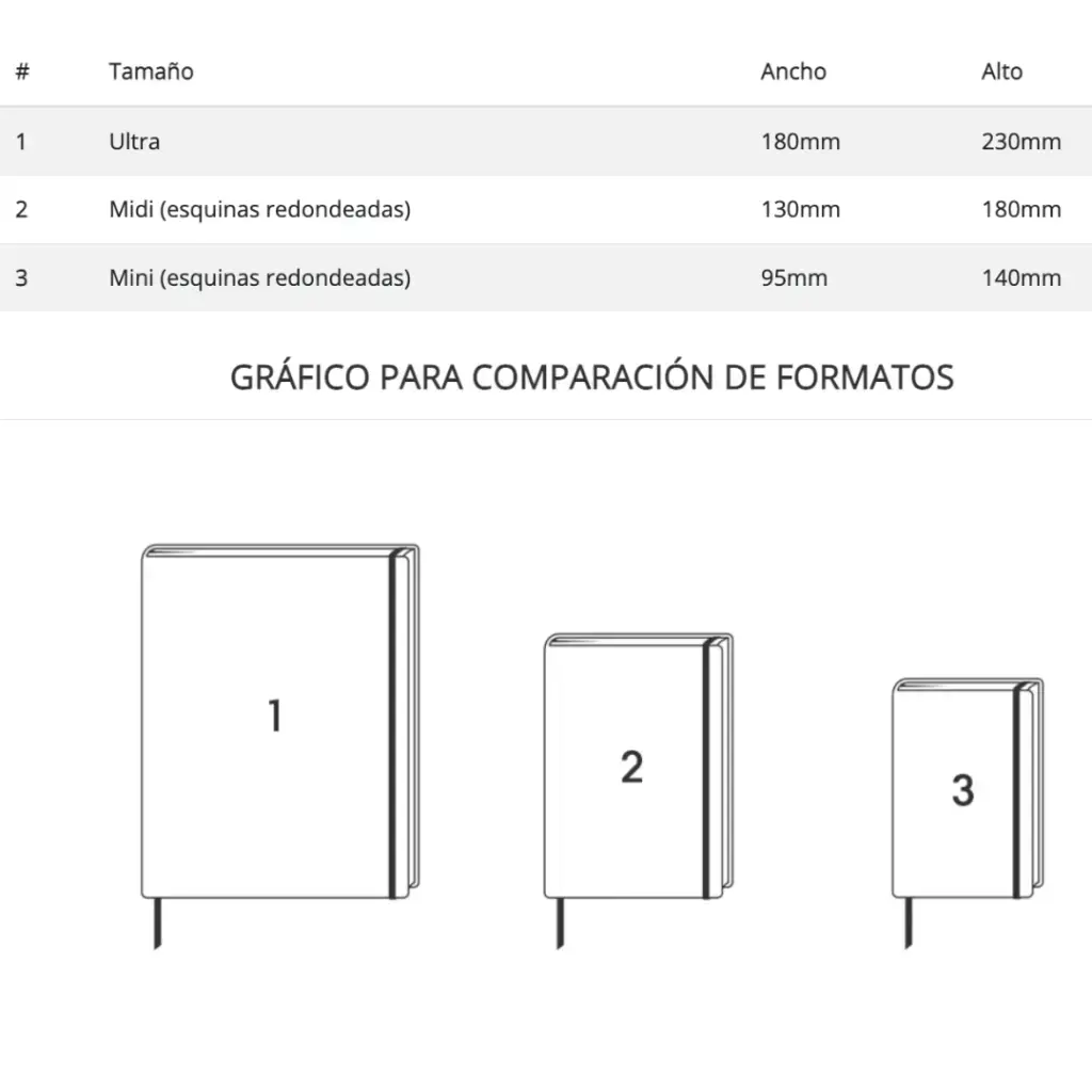 • Midi – Versátil y equilibrado, ideal para uso diario. (120 × 180 mm, 144 páginas rayadas, 120 g/m²)