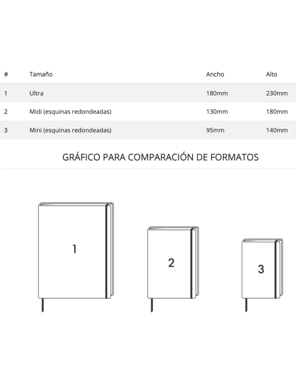• Midi – Versátil y equilibrado, ideal para uso diario. (120 × 180 mm, 144 páginas rayadas, 120 g/m²)